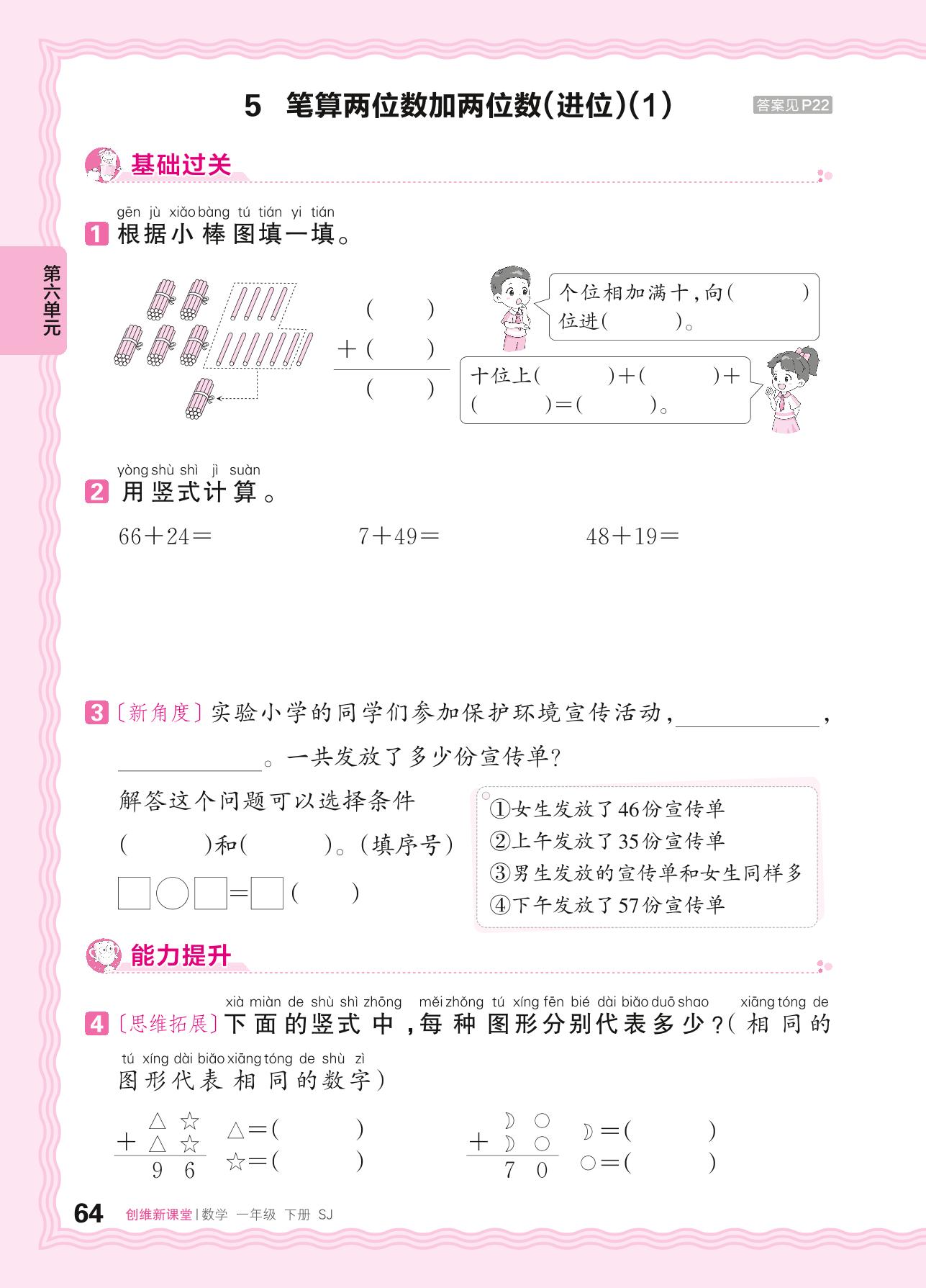 2024春下册一年级数学苏教版 第六单元 100以内的加法和减法(二)——5. 笔算两位数加两位数(进位)(1)