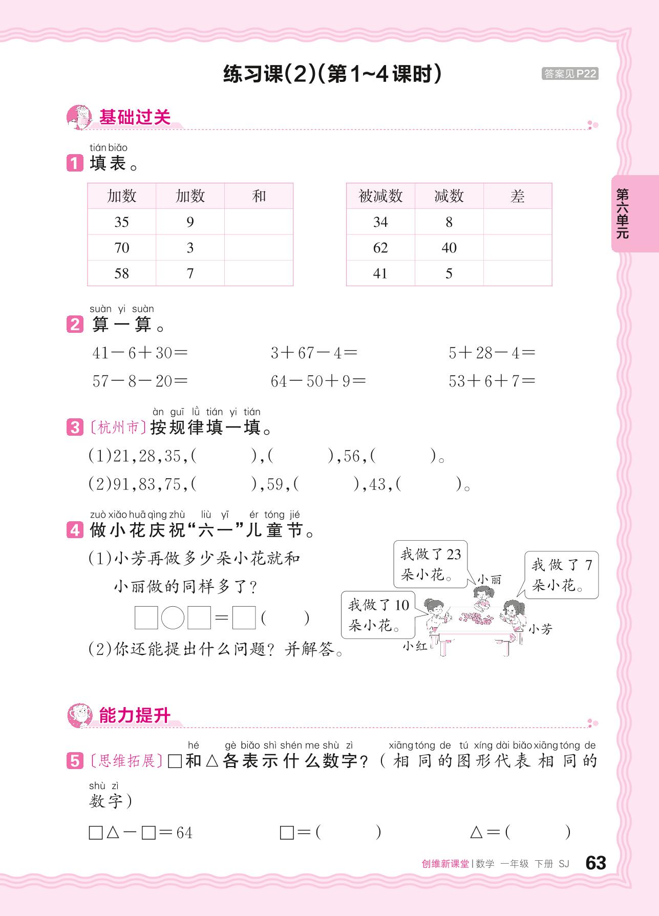 2024春下册一年级数学苏教版 第六单元 100以内的加法和减法(二)——口算两位数加一位数(进位)、口算两位数减一位数(退位)练习课(2)