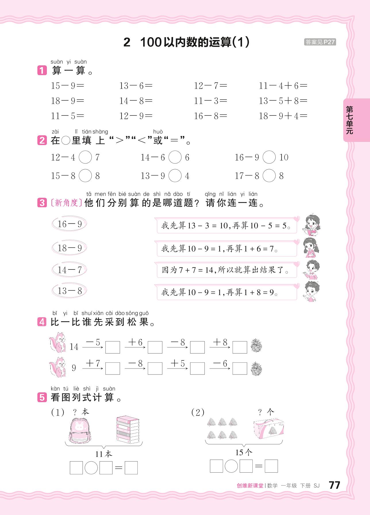 2024春下册一年级数学苏教版 第七单元 期末复习——2. 100以内数的运算(1)