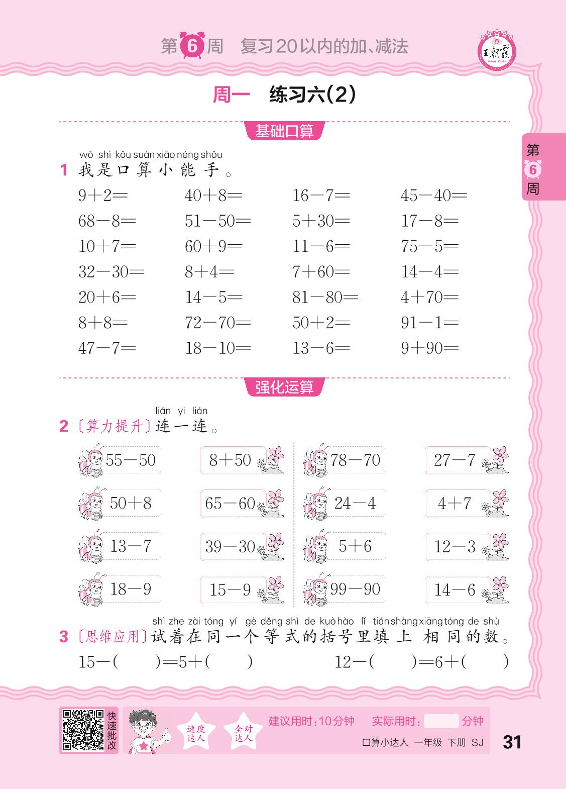 2024春下册一年级数学苏教版 口算计算专练 第6周