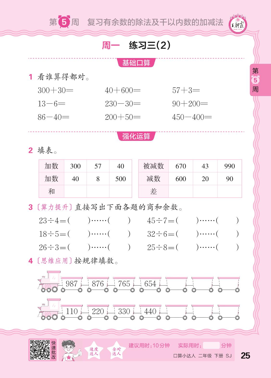 2024春下册二年级数学苏教版 口算计算专练 第5周