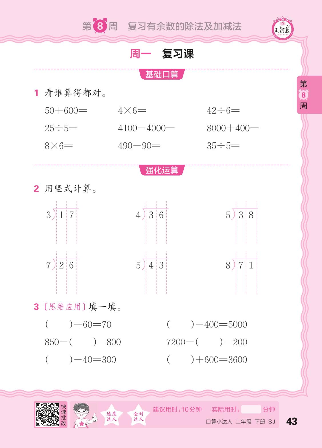 2024春下册二年级数学苏教版 口算计算专练 第8周