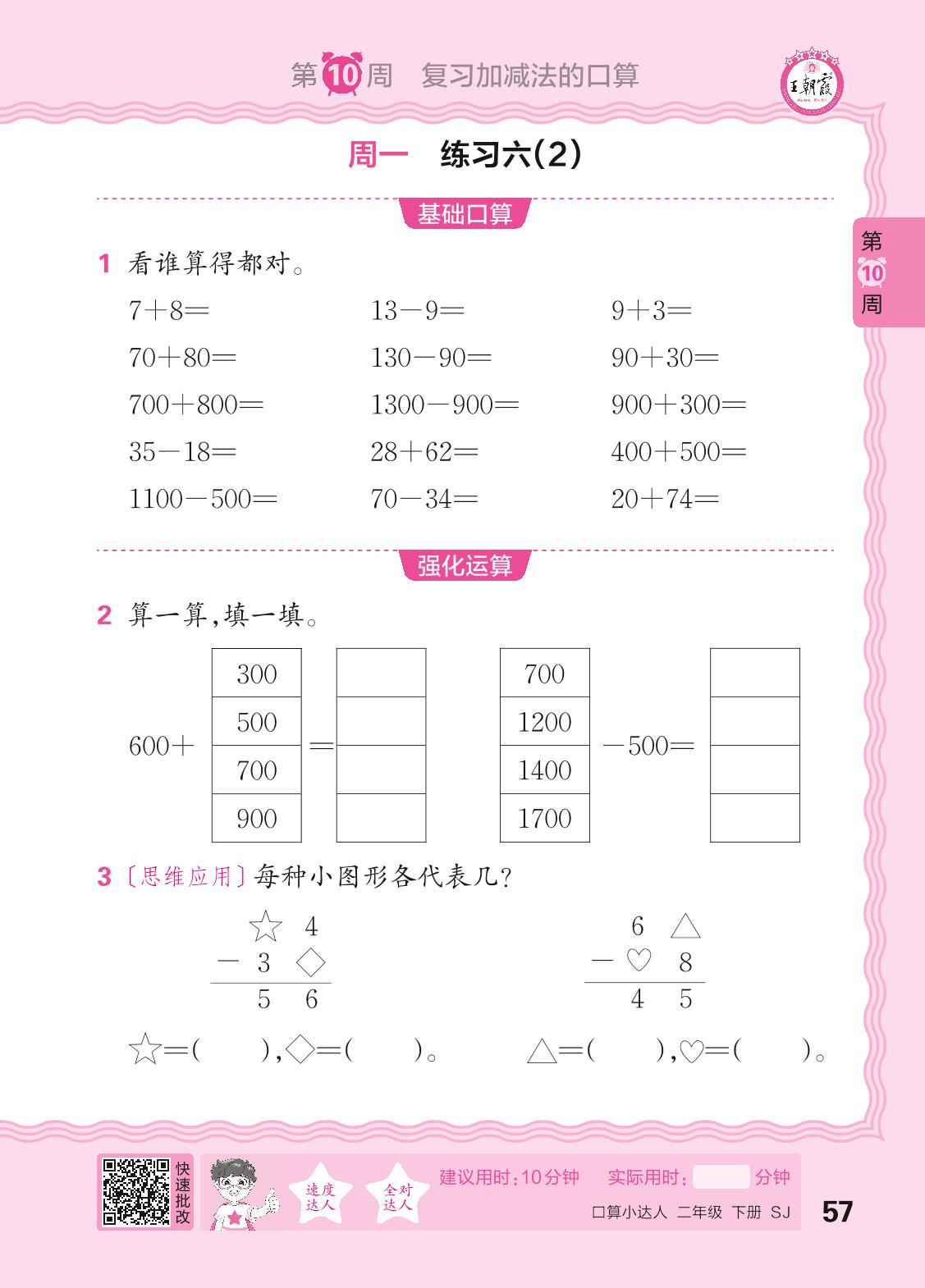 2024春下册二年级数学苏教版 口算计算专练 第10周