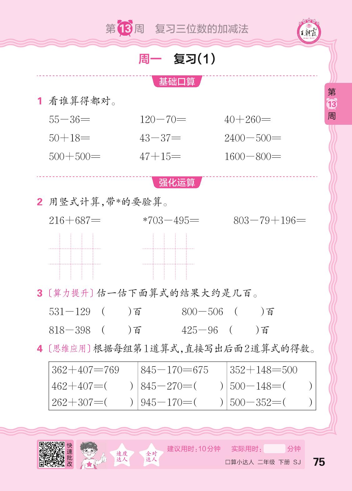 2024春下册二年级数学苏教版 口算计算专练 第13周