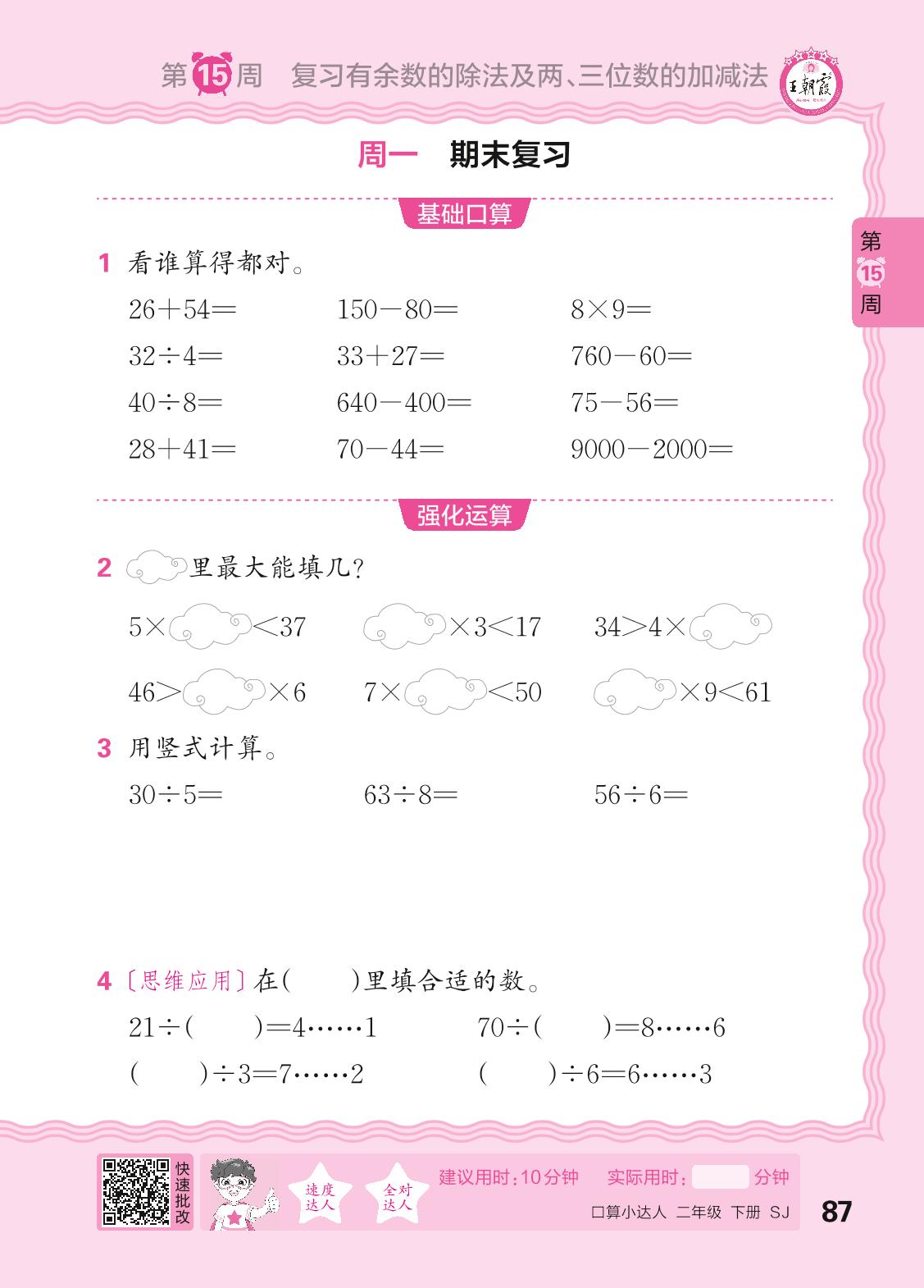2024春下册二年级数学苏教版 口算计算专练 第15周