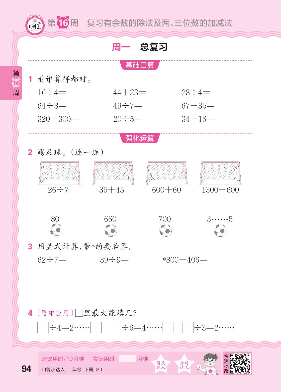 2024春下册二年级数学苏教版 口算计算专练 第16周