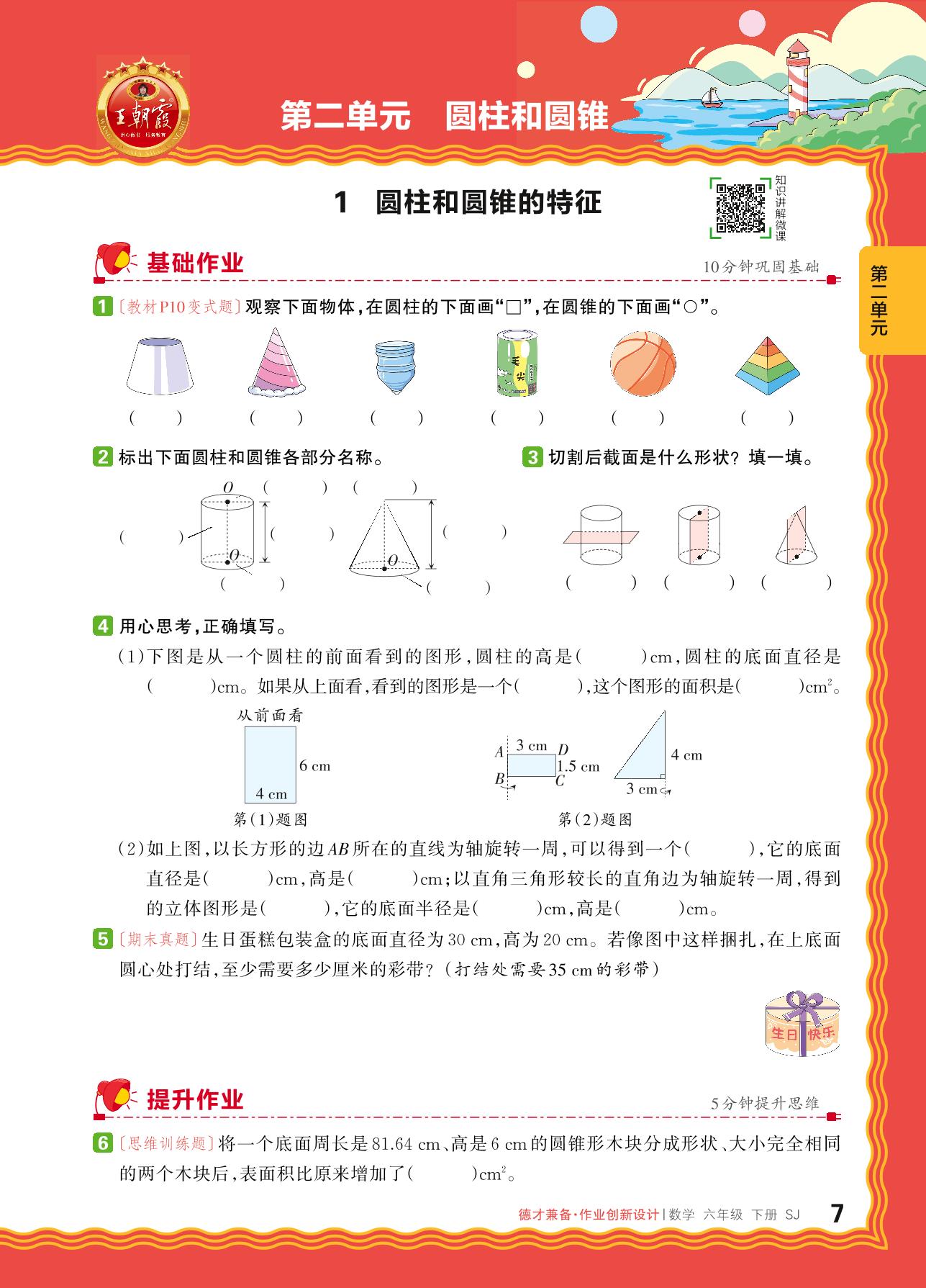 2024春下册六年级数学苏教版 第二单元 圆柱和圆锥——1. 圆柱和圆锥的特征