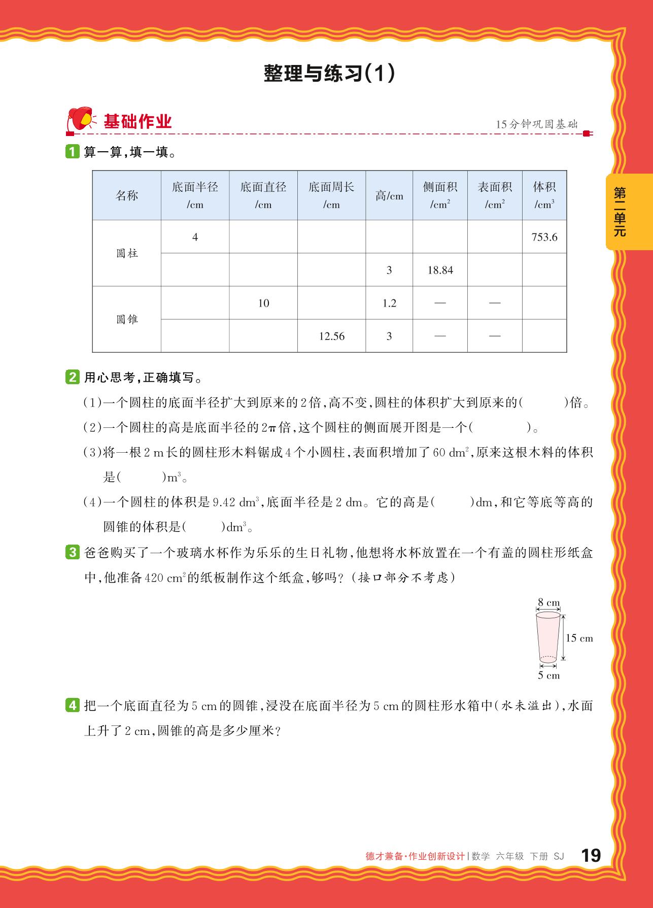2024春下册六年级数学苏教版 第二单元 圆柱和圆锥——整理与练习(1)