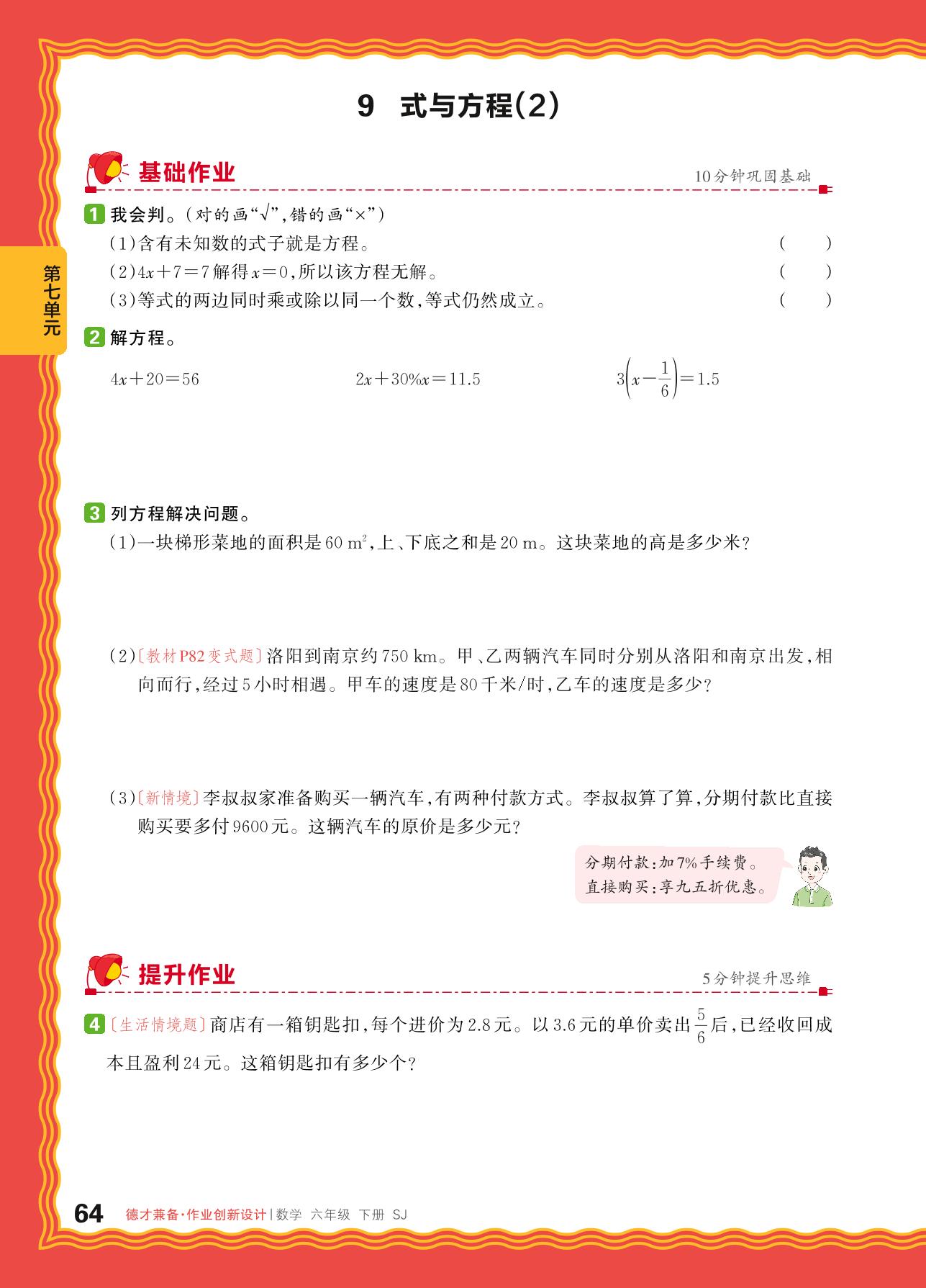 2024春下册六年级数学苏教版 第七单元 总复习(数与代数)——9. 式与方程(2)
