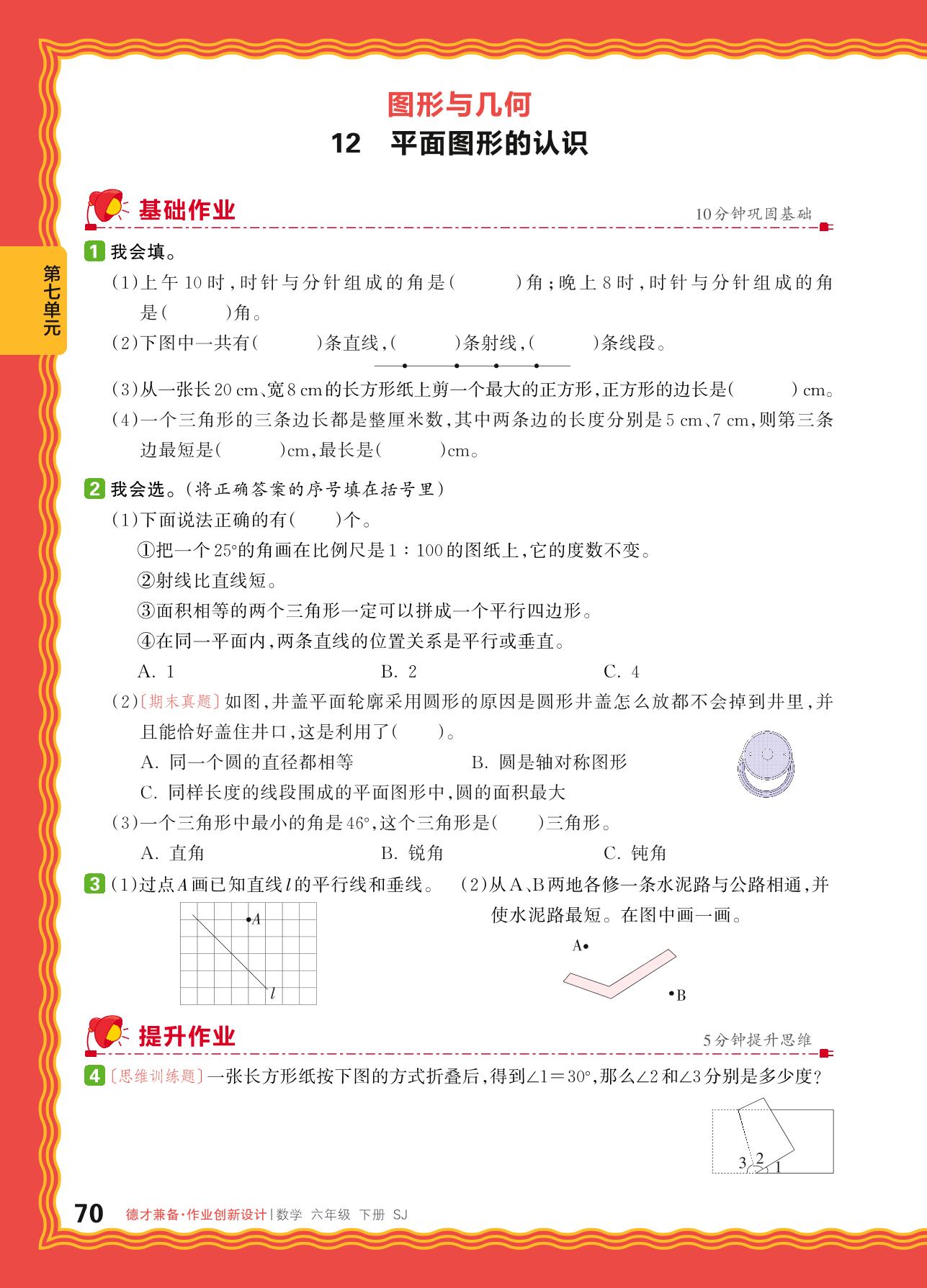 2024春下册六年级数学苏教版 第七单元 总复习(图形与几何)——12. 平面图形的认识