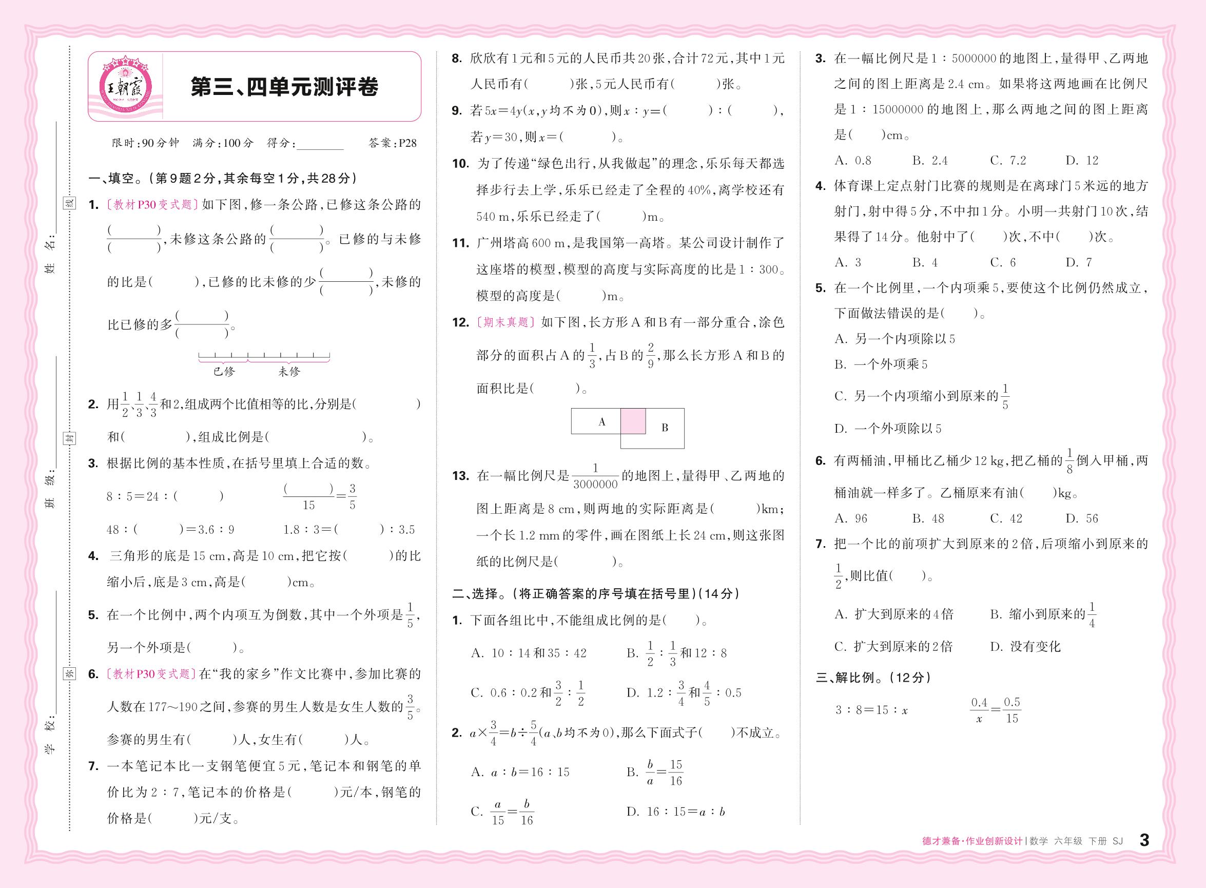 2024春下册六年级数学苏教版 第三、四单元测评卷