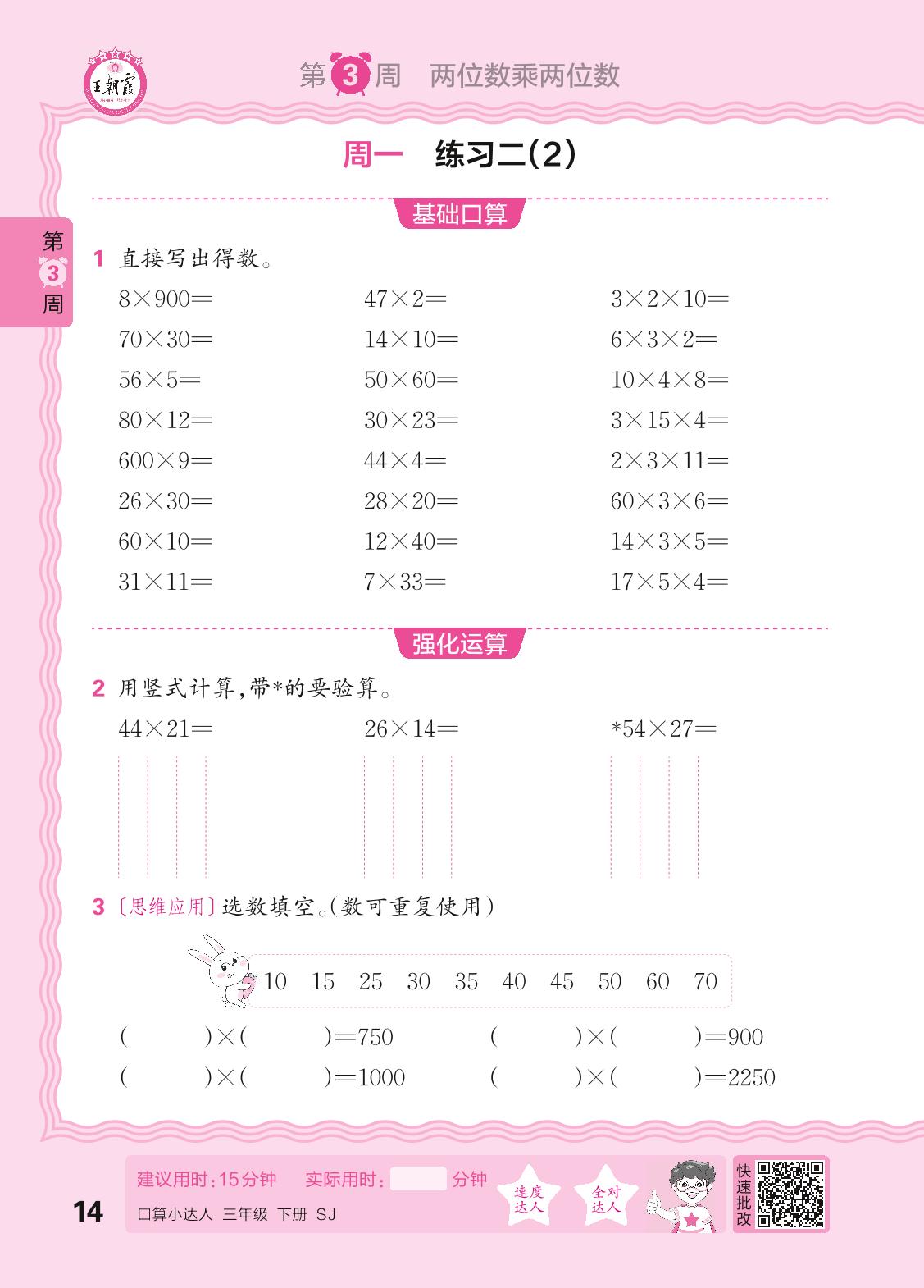 2024春下册三年级数学苏教版 口算计算专练 第3周