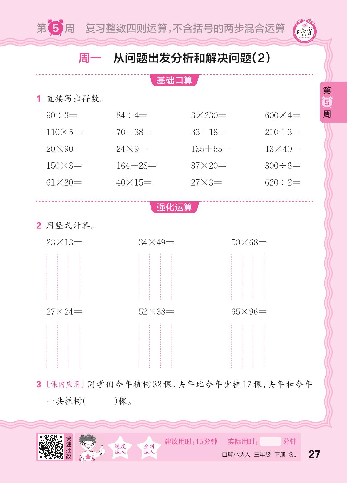 2024春下册三年级数学苏教版 口算计算专练 第5周