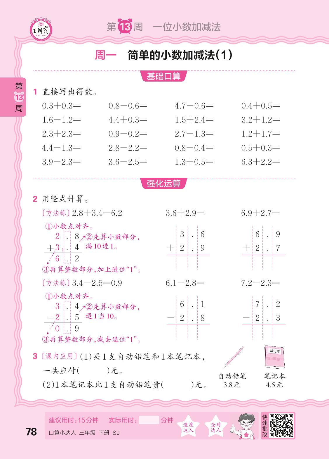 2024春下册三年级数学苏教版 口算计算专练 第13周