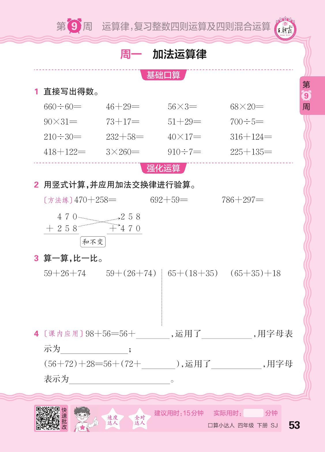 2024春下册四年级数学苏教版 口算计算专练 第9周