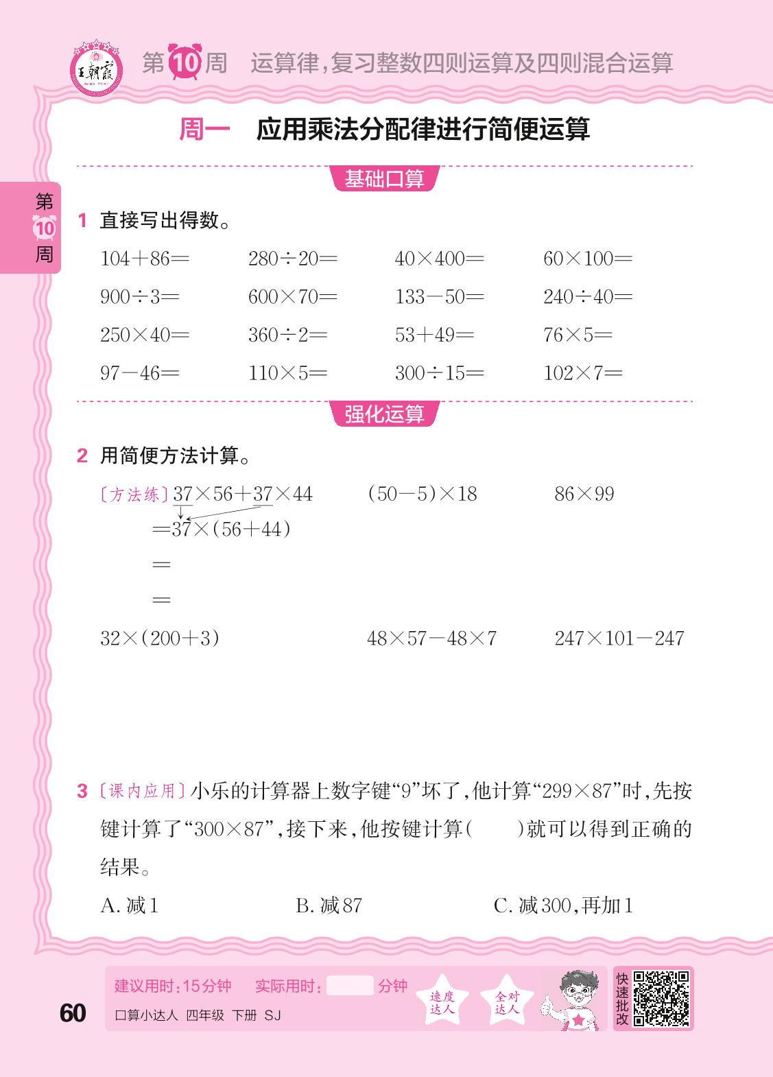 2024春下册四年级数学苏教版 口算计算专练 第10周