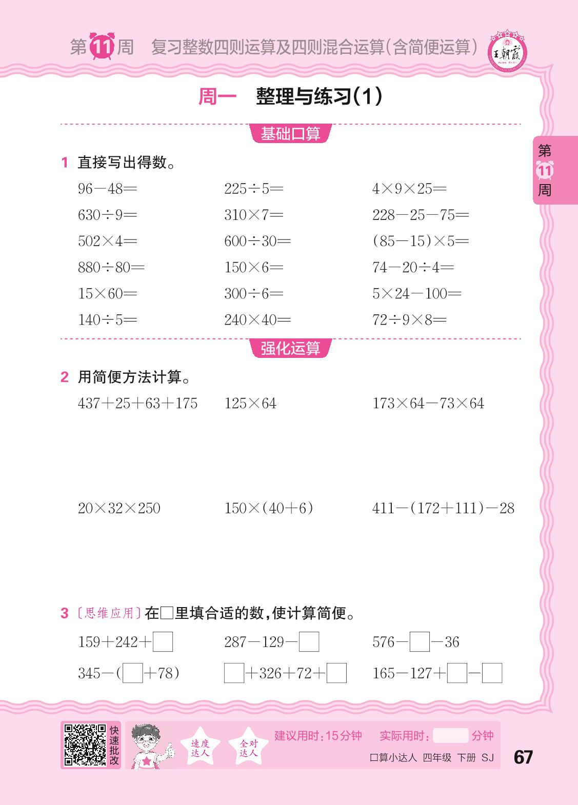 2024春下册四年级数学苏教版 口算计算专练 第11周