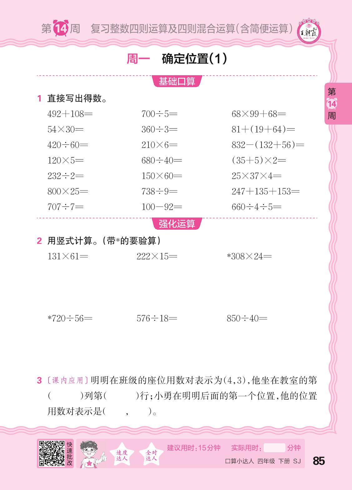 2024春下册四年级数学苏教版 口算计算专练 第14周