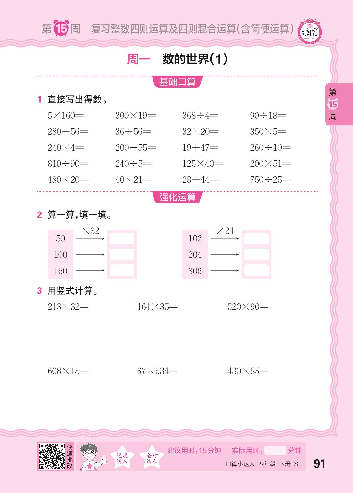 2024春下册四年级数学苏教版 口算计算专练 第15周