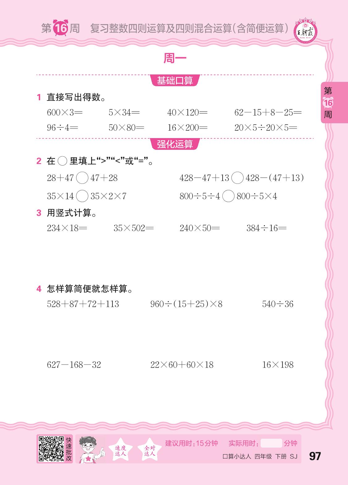 2024春下册四年级数学苏教版 口算计算专练 第16周