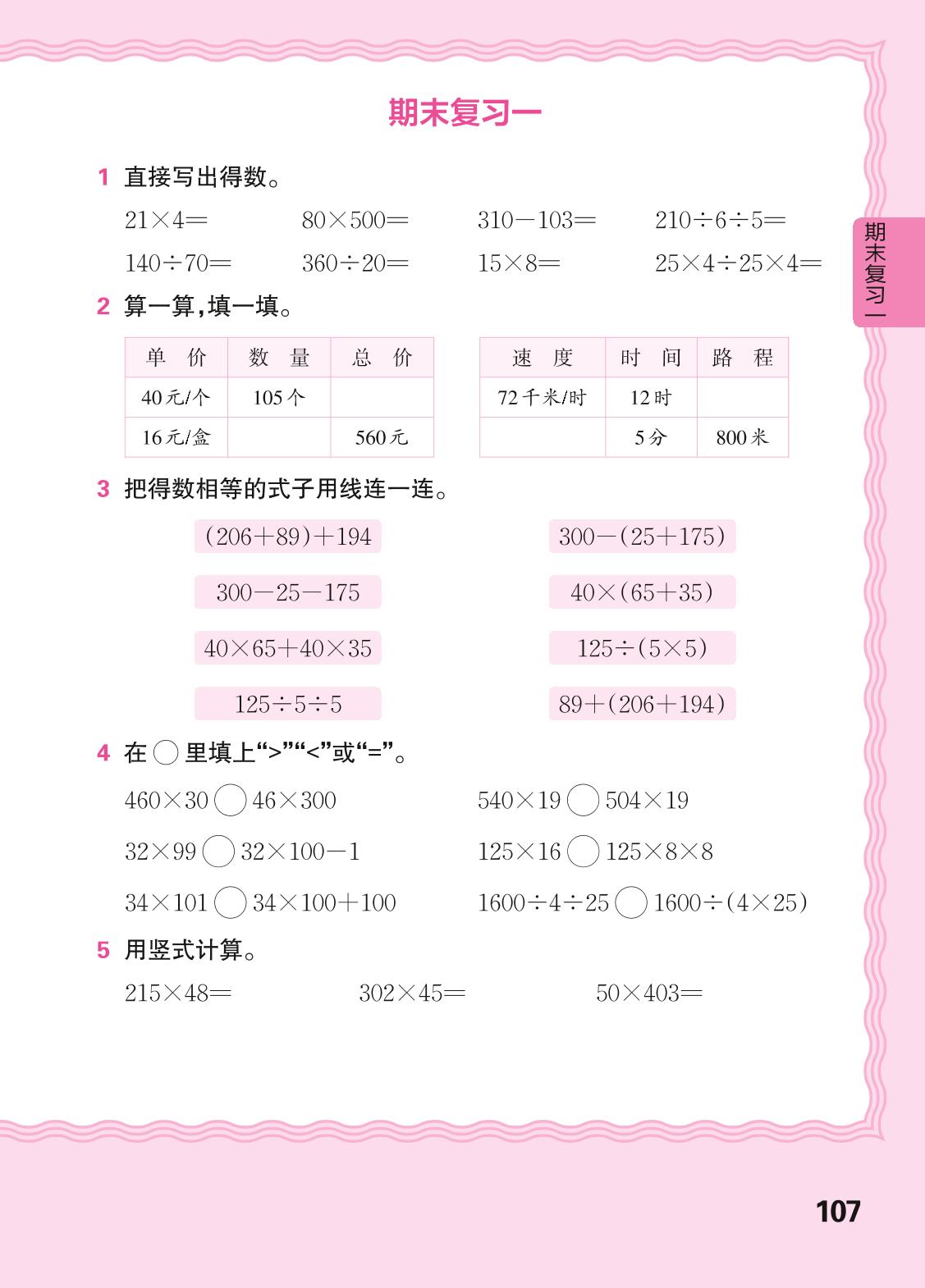 2024春下册四年级数学苏教版 期末复习一(计算专练)