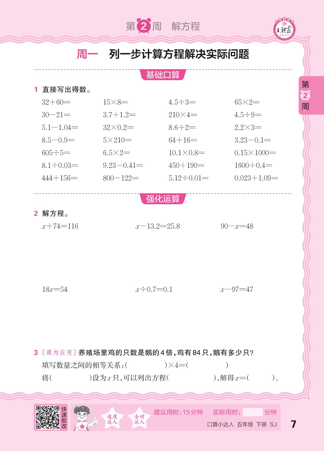 2024春下册五年级数学苏教版 口算计算专练 第2周