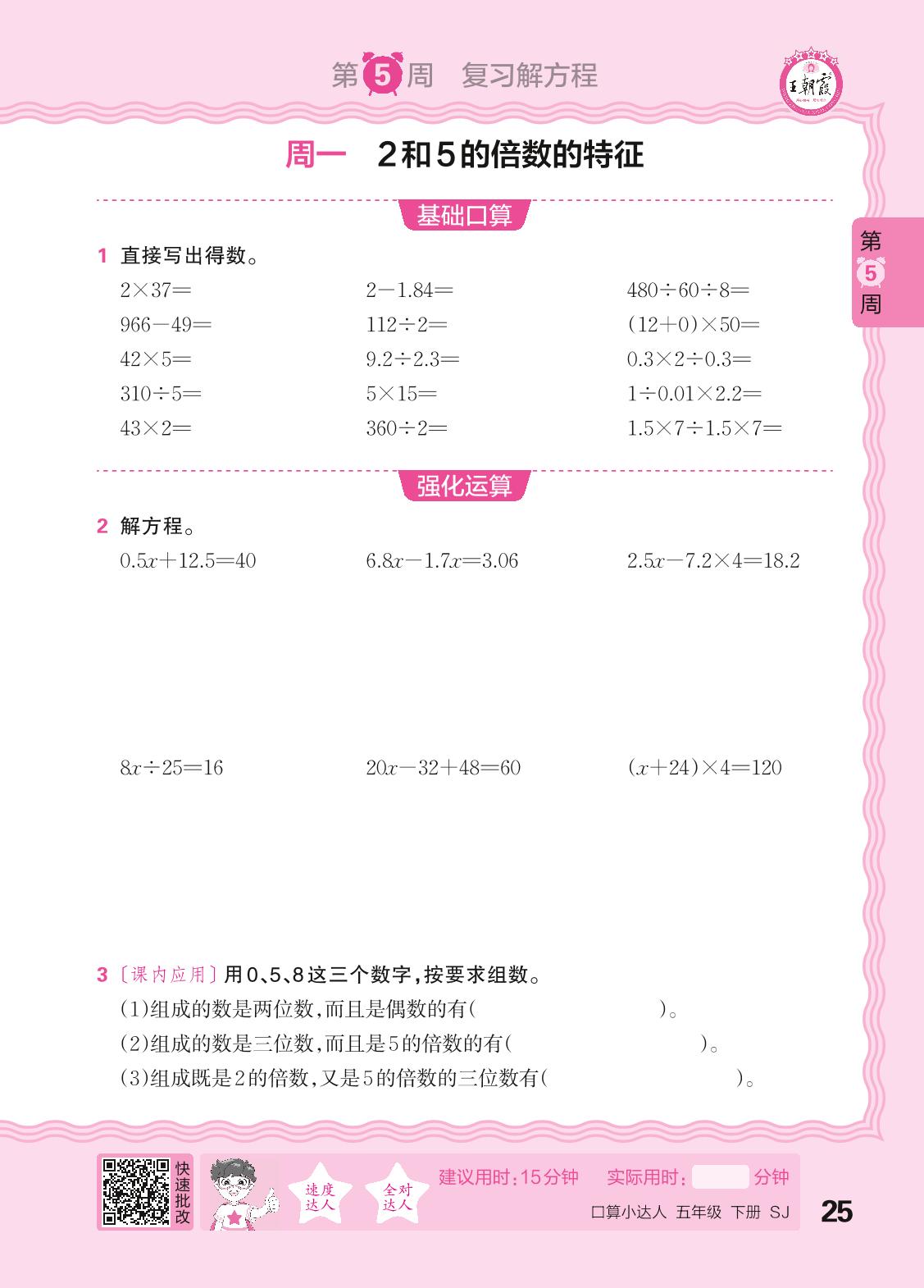 2024春下册五年级数学苏教版 口算计算专练 第5周