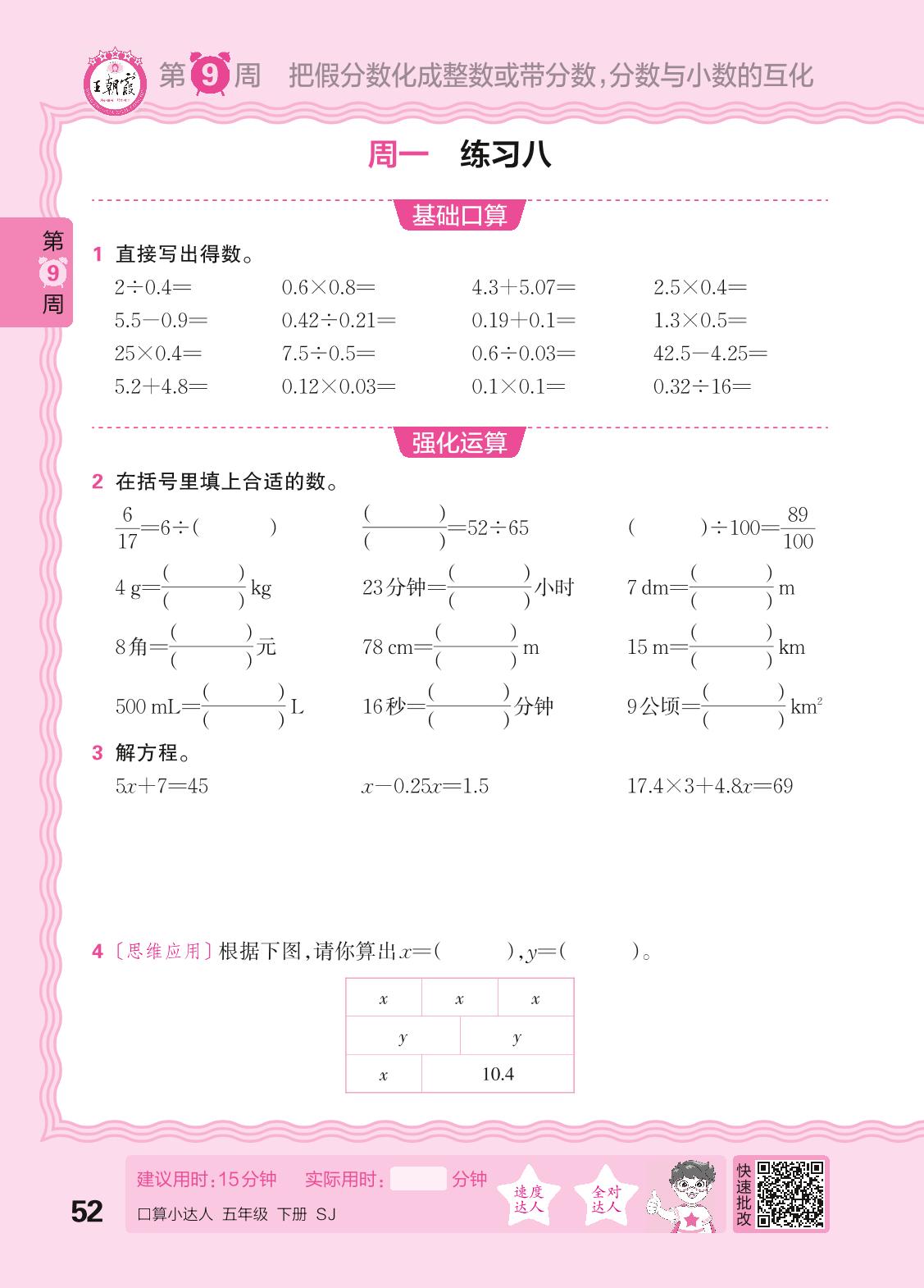 2024春下册五年级数学苏教版 口算计算专练 第9周