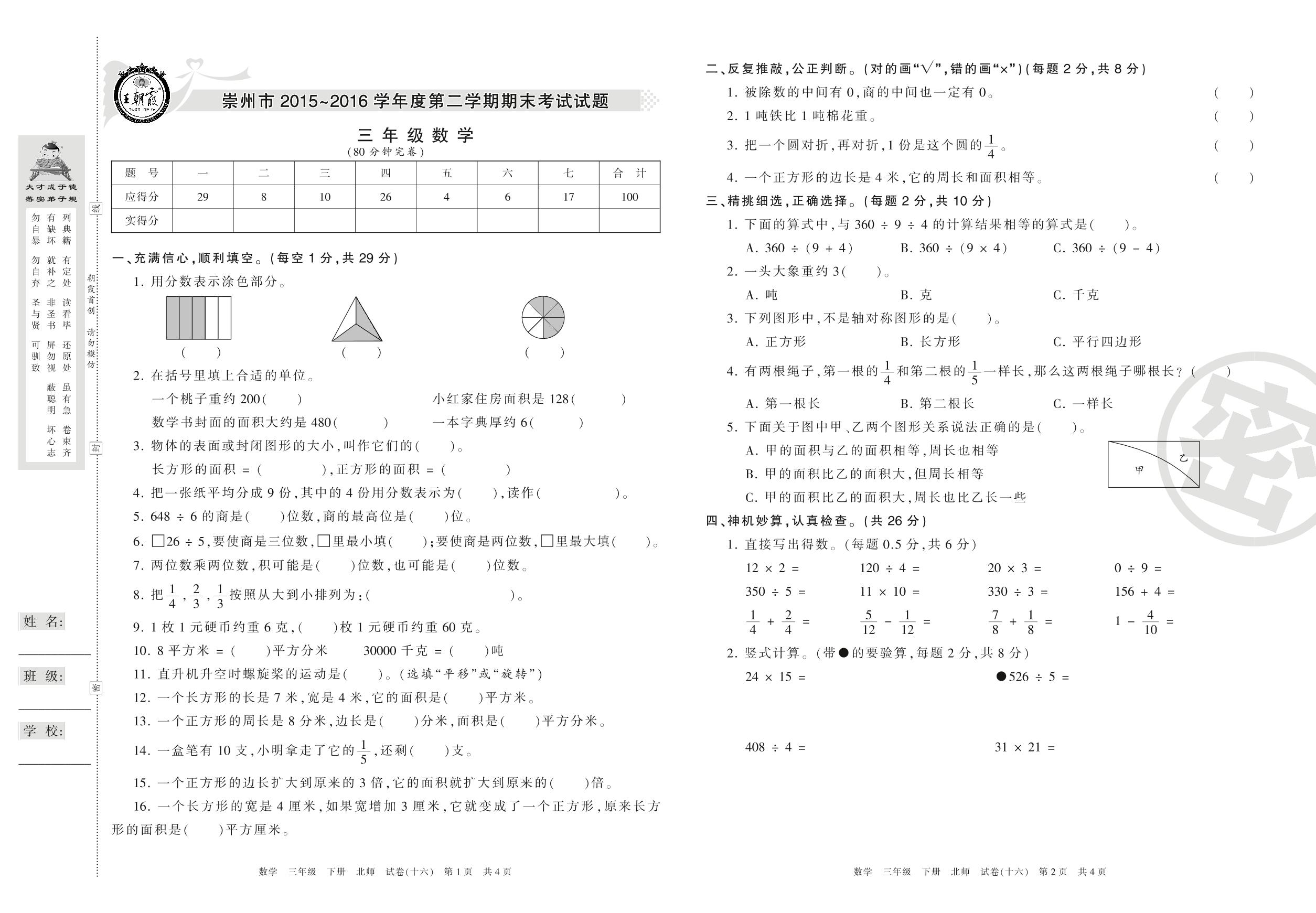 2015-2016学年第二学期崇州市三年级数学试卷(北师版)【16】