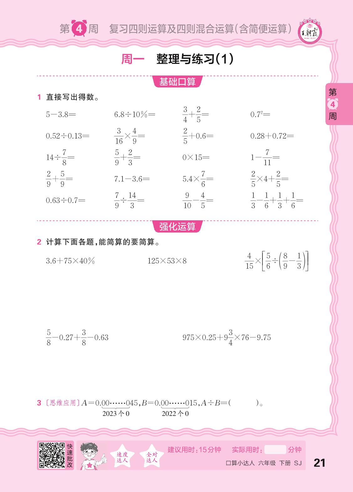 2024春下册六年级数学苏教版 口算计算专练 第4周