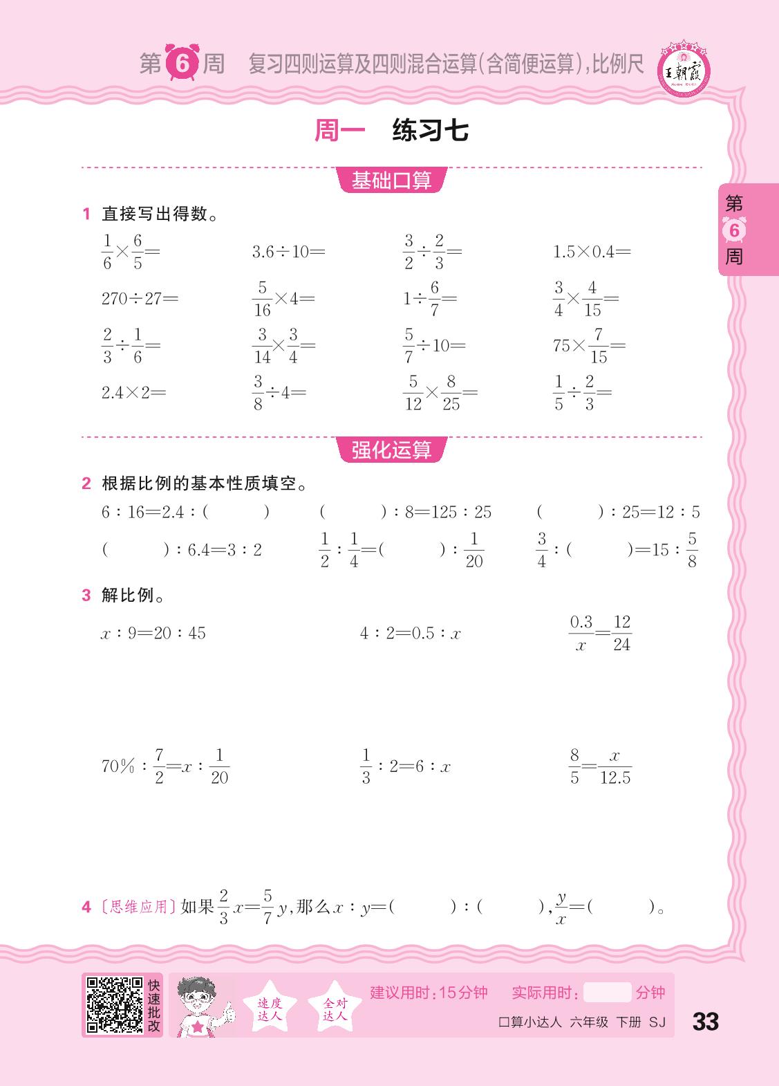 2024春下册六年级数学苏教版 口算计算专练 第6周
