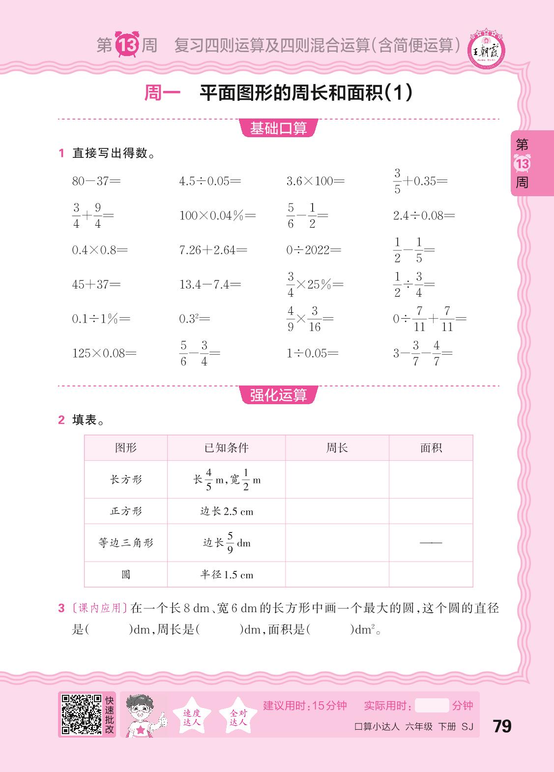 2024春下册六年级数学苏教版 口算计算专练 第13周