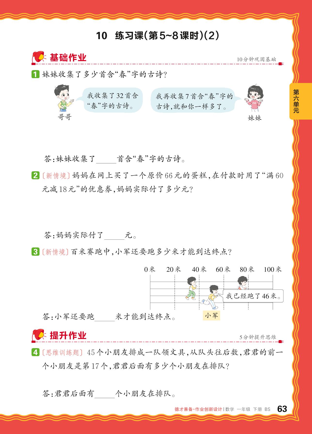 2024春下册一年级数学北师版 第六单元 加与减(三)——阅览室、跳绳(2)练习课