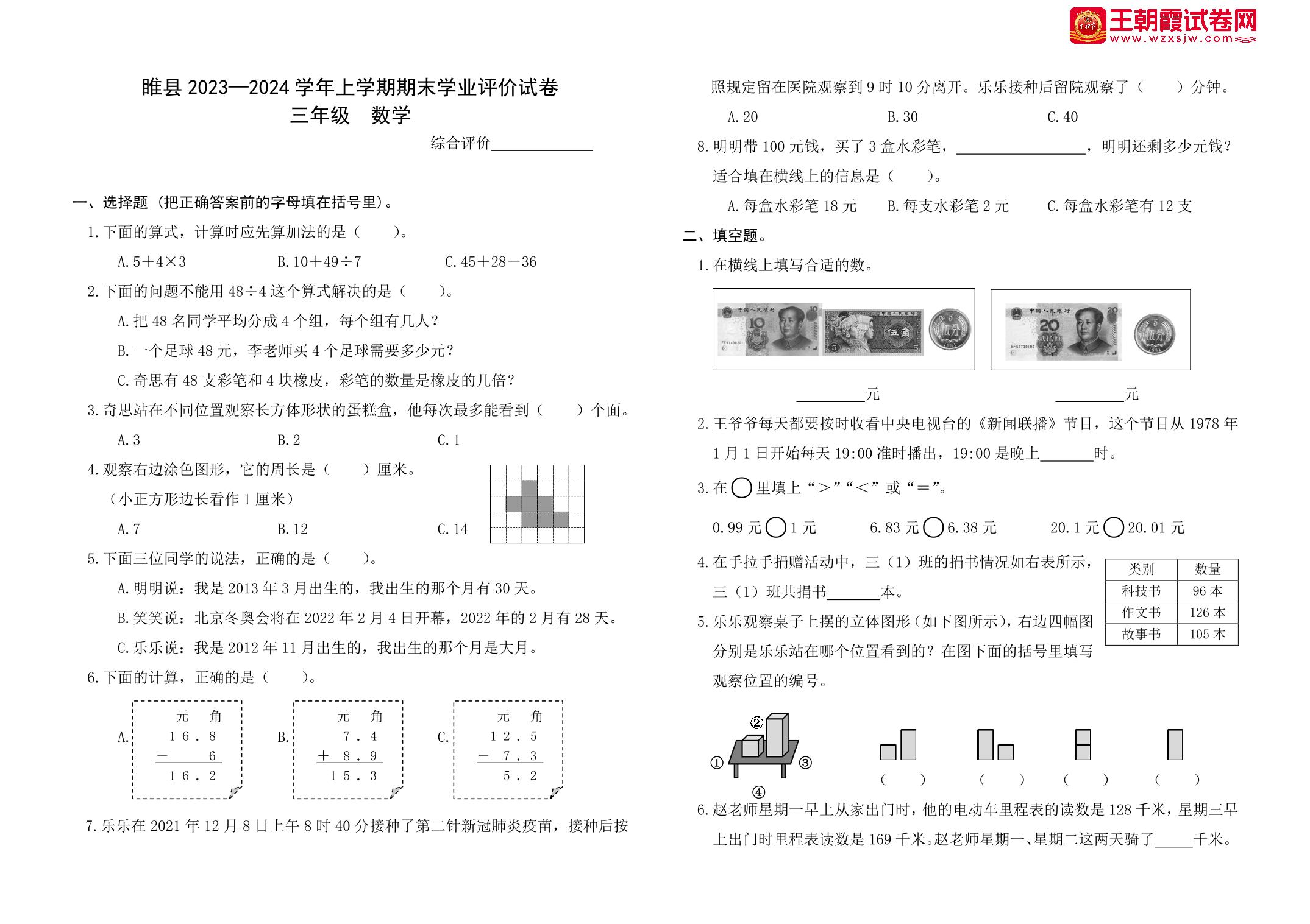 河南省商丘市睢县2023-2024学年上学期期末小学学业评价试卷三年级数学(人教版)