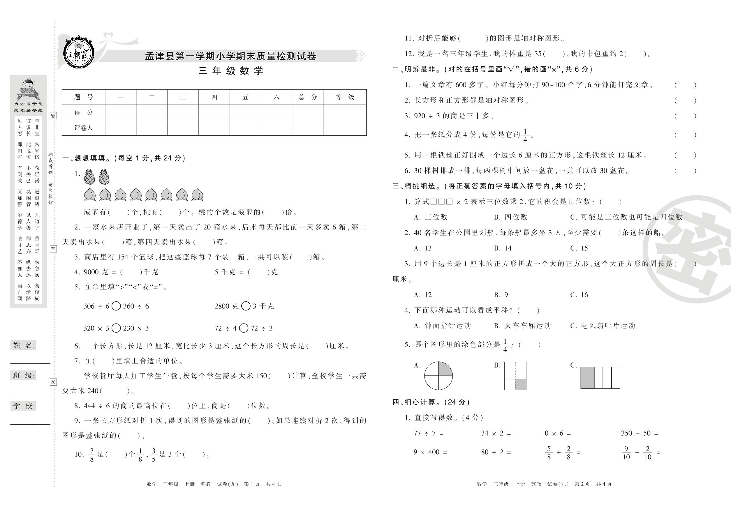 2016-2017学年第一学期洛阳市孟津县三年级数学试卷(苏教版)【9】