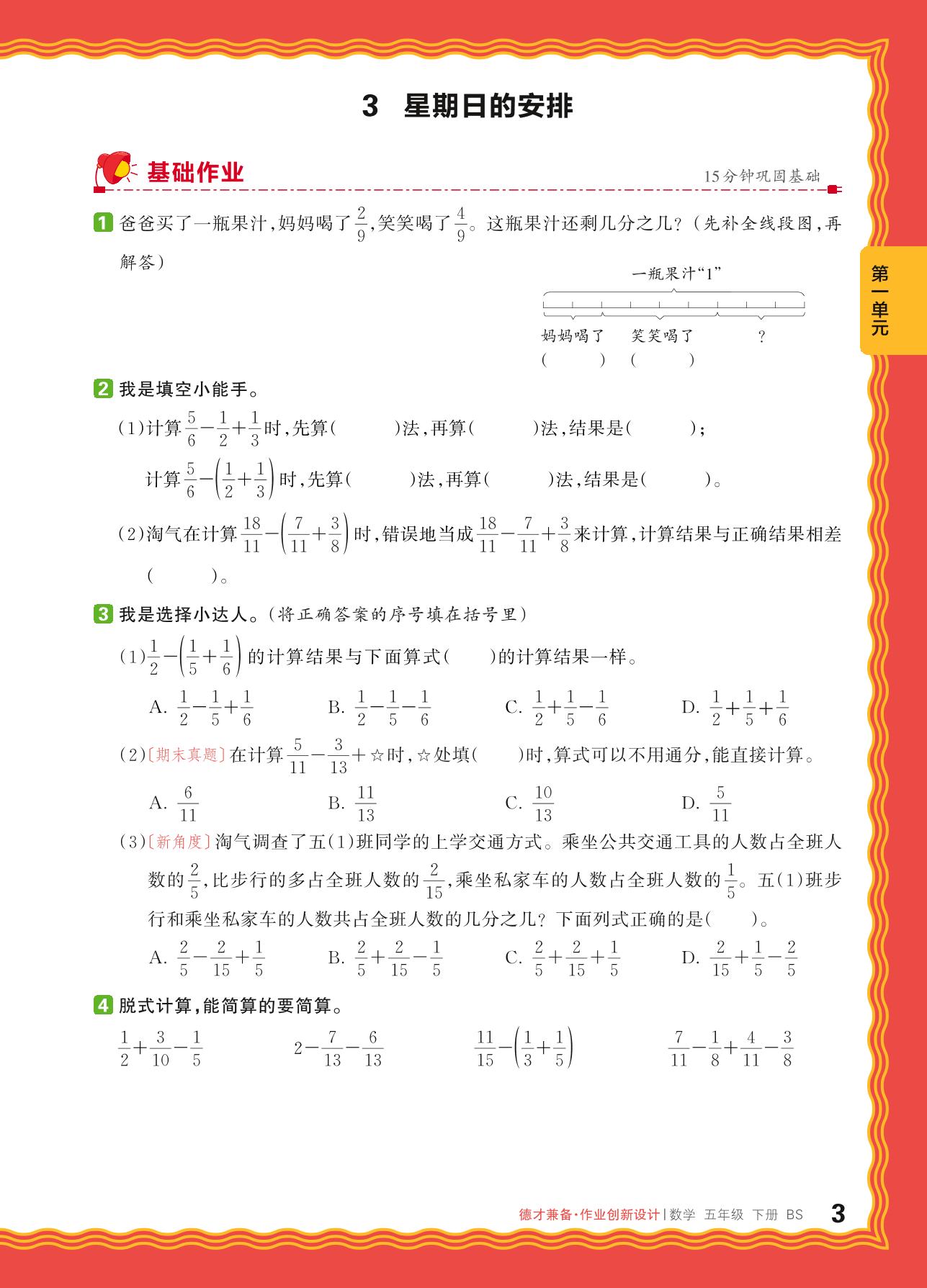2024春下册五年级数学北师版 第一单元 分数加减法——3. 星期日的安排_R240123175053008