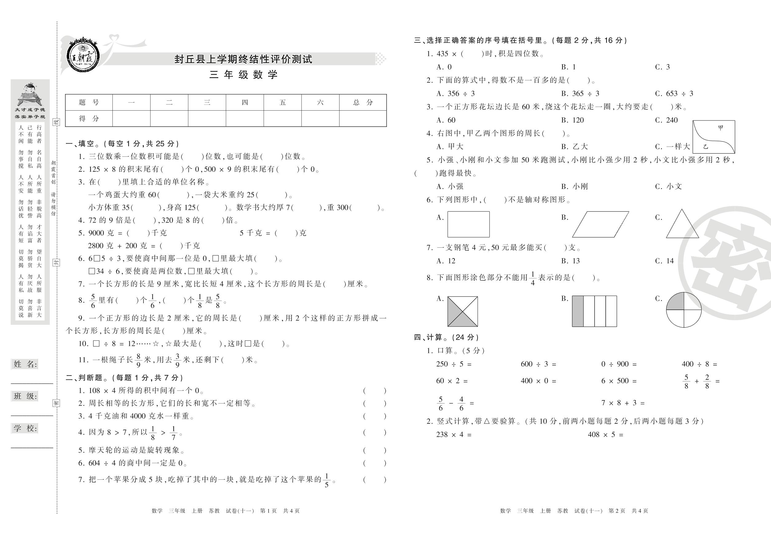 2016-2017学年第一学期新乡市封丘县三年级数学试卷(苏教版)【11】