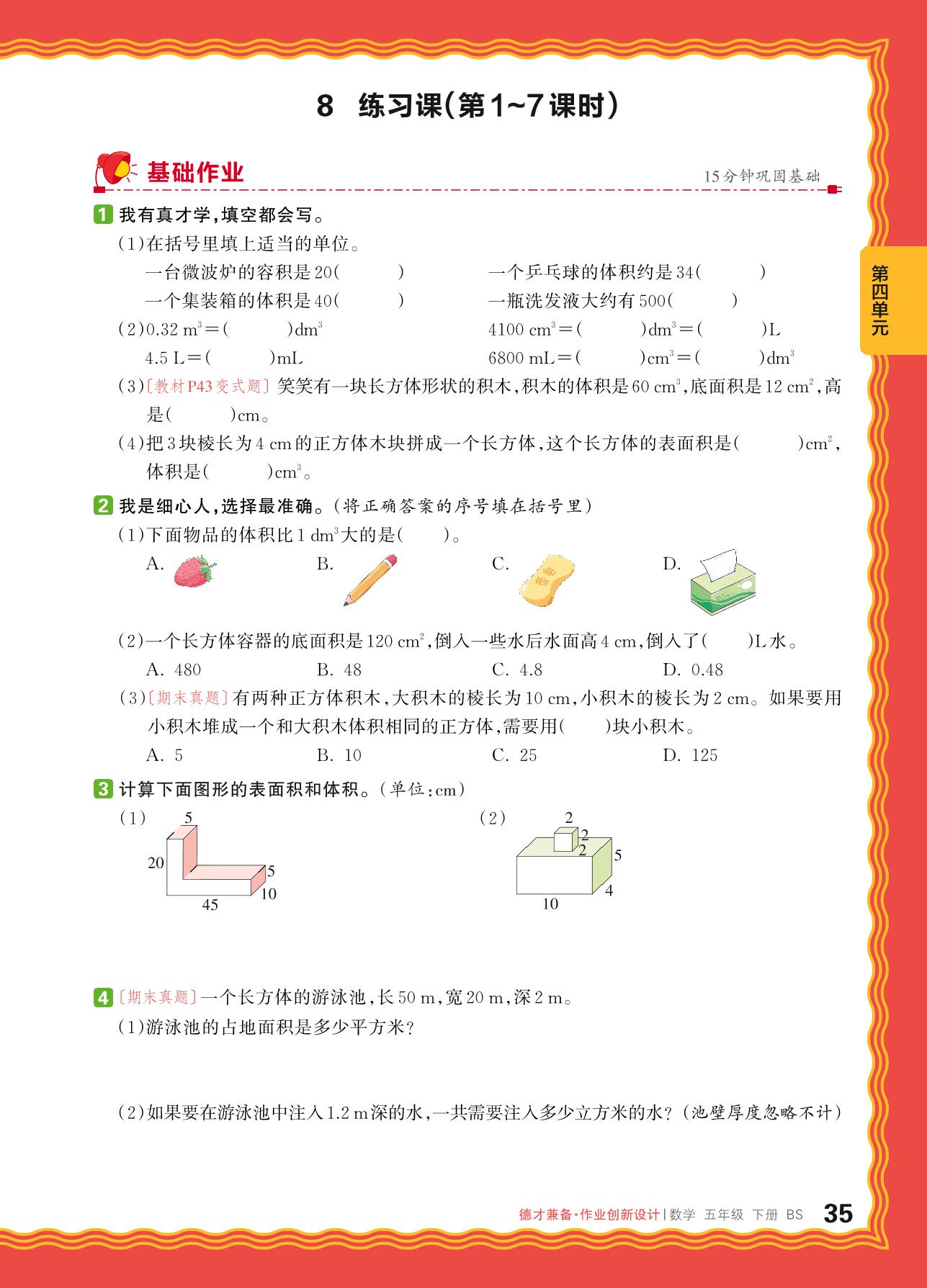 2024春下册五年级数学北师版 第四单元长方体(二)练习课