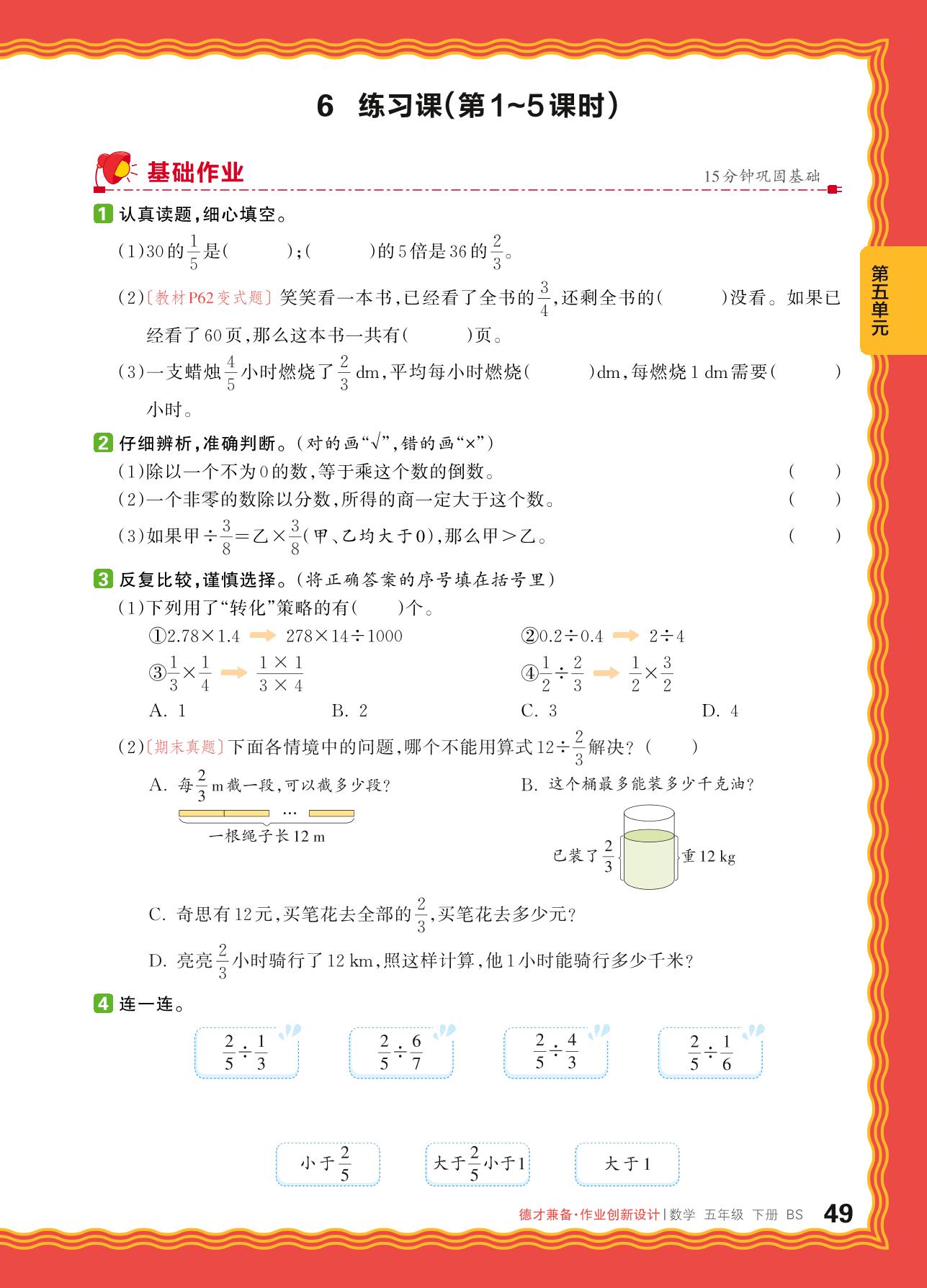 2024春下册五年级数学北师版 第五单元分数除法练习课