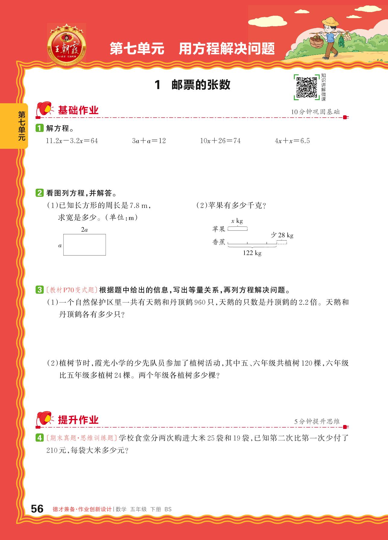 2024春下册五年级数学北师版 第七单元 用方程解决问题——1. 邮票的张数