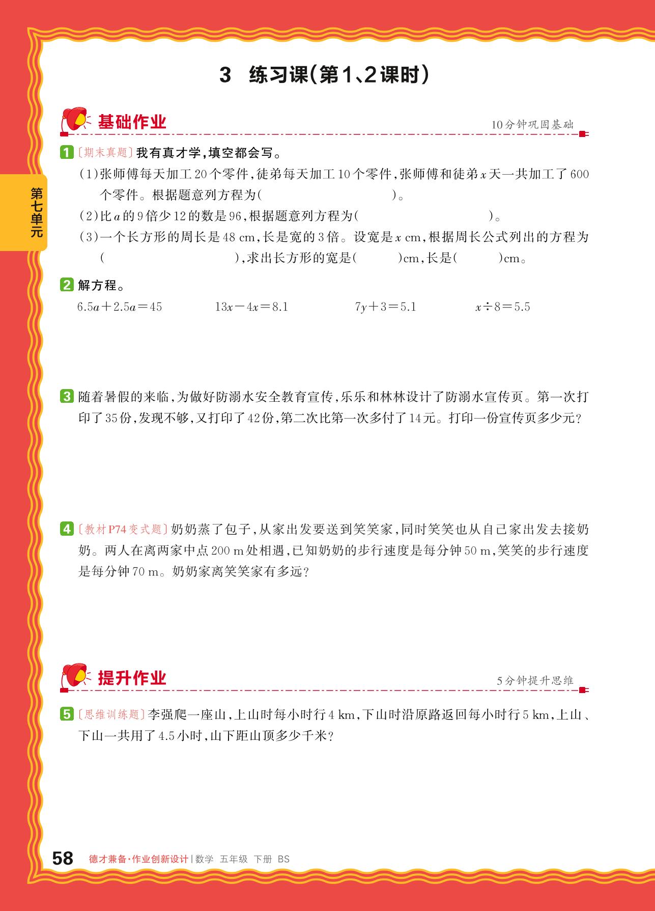 2024春下册五年级数学北师版 第七单元用方程解决问题练习课