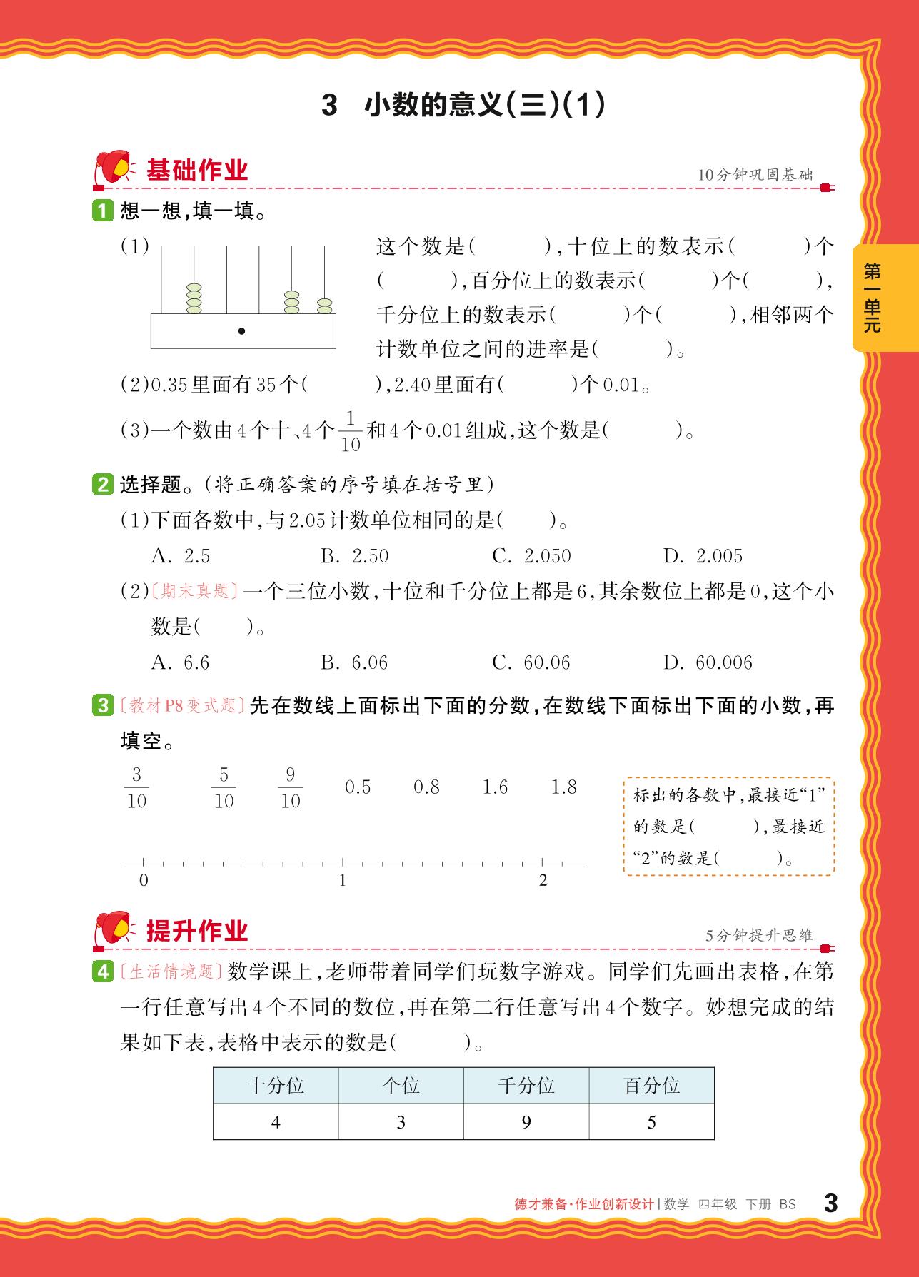 2024春下册四年级数学北师版 第一单元 小数的意义和加减法——3. 小数的意义(三)(1)_R240124090129996