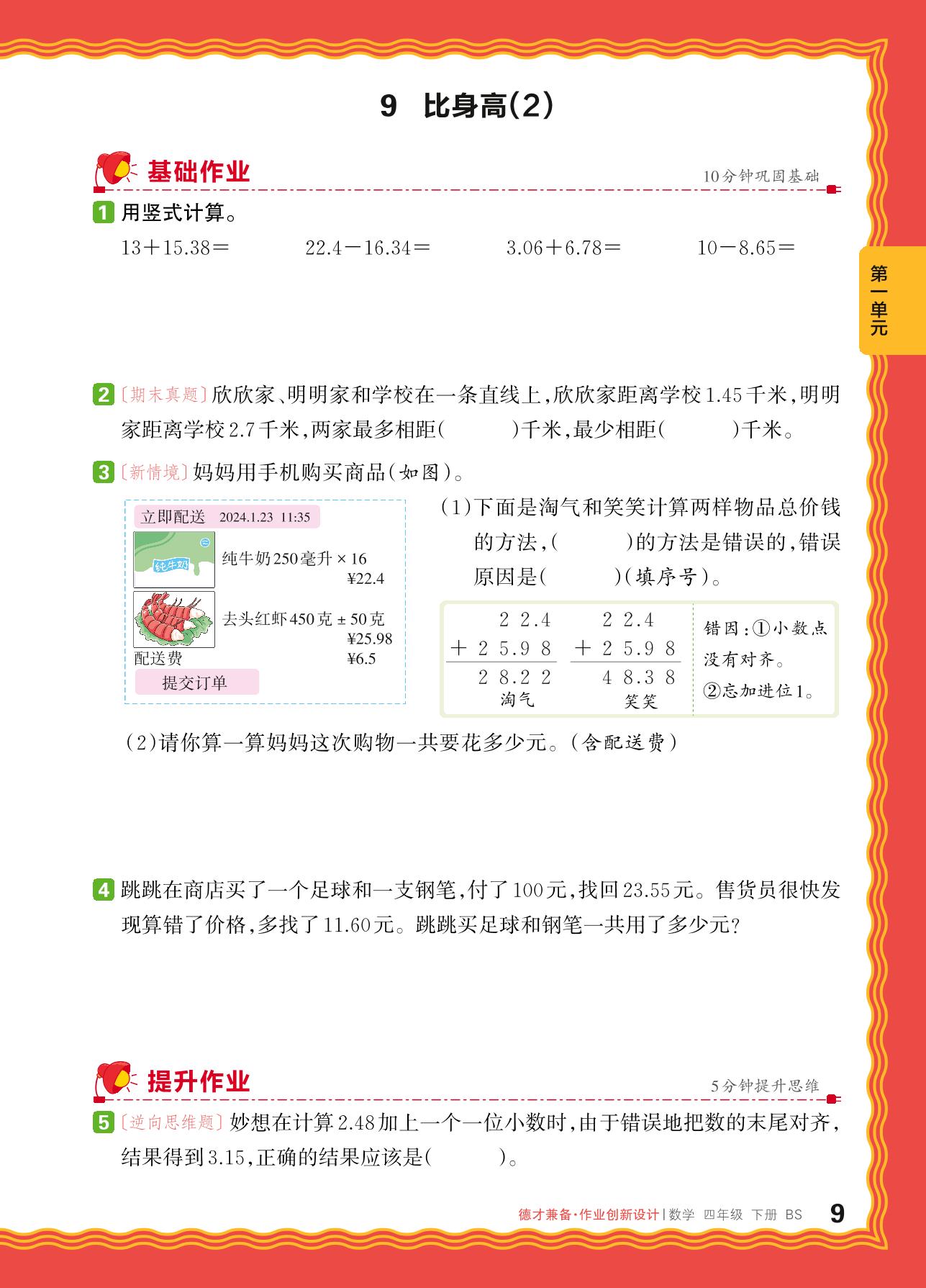 2024春下册四年级数学北师版 第一单元 小数的意义和加减法——9. 比身高(2)