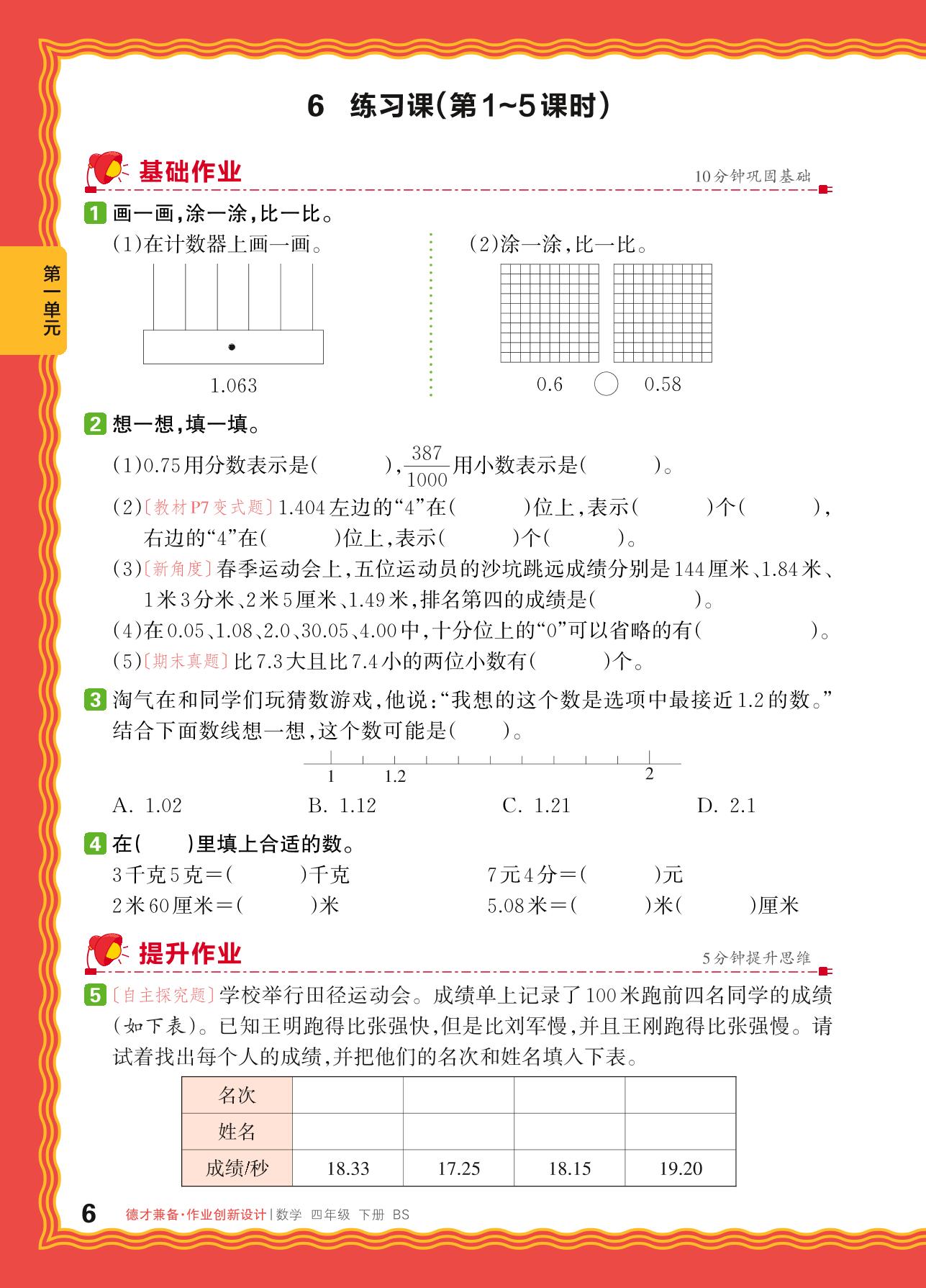 2024春下册四年级数学北师版 第一单元 小数的意义和加减法——小数的意义(一)、小数的意义(二)、小数的意义(三)练习课