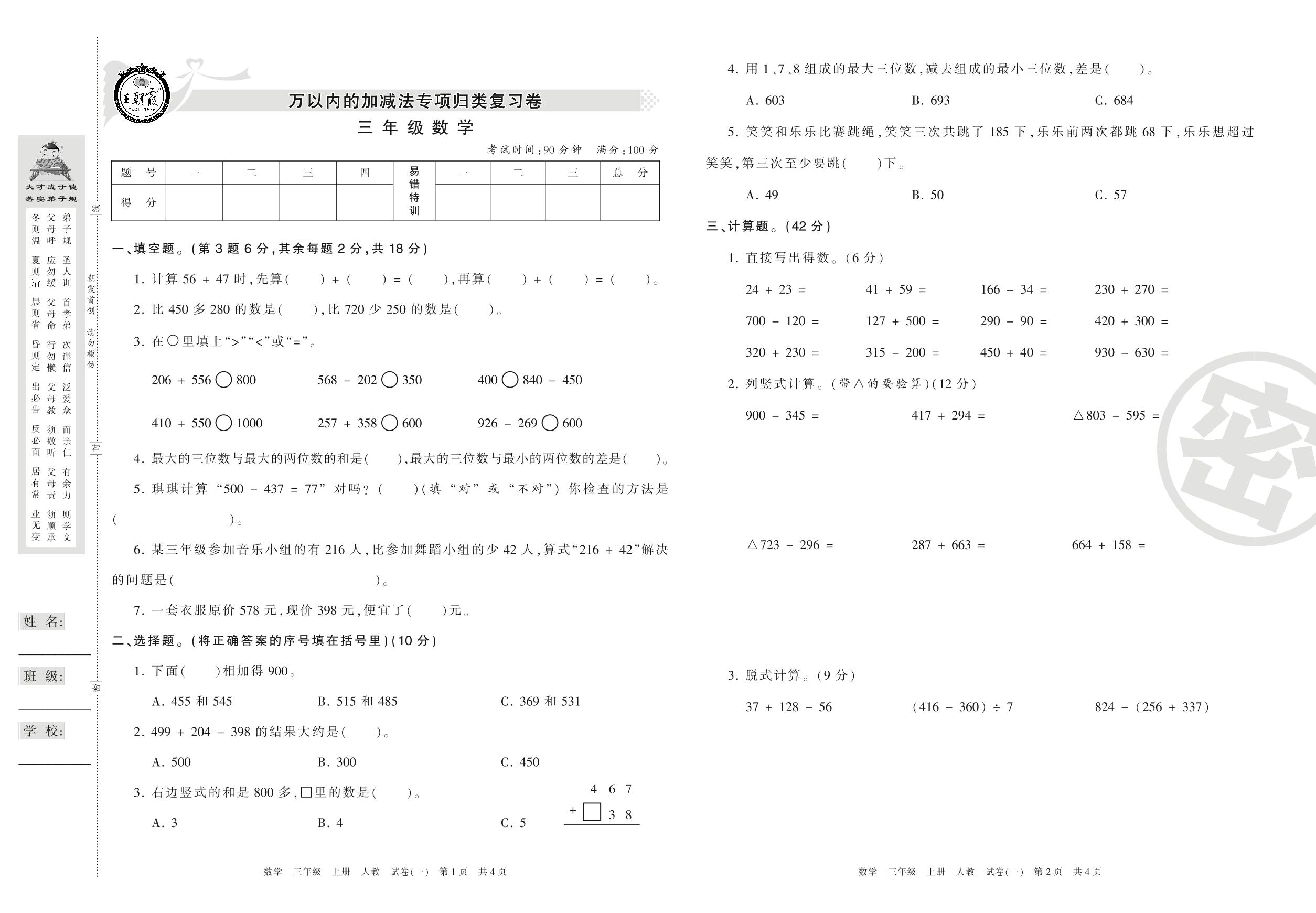 王朝霞期末专项卷三年级上册数学(人教版)_R210804104301【1】