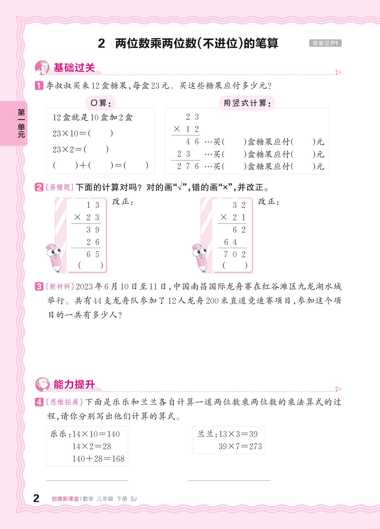 2024春下册三年级数学苏教版 第一单元 两位数乘两位数——2. 两位数乘两位数(不进位)的笔算