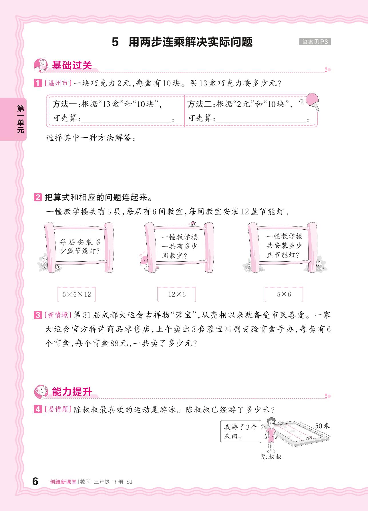 2024春下册三年级数学苏教版 第一单元 两位数乘两位数——5. 用两步连乘解决实际问题