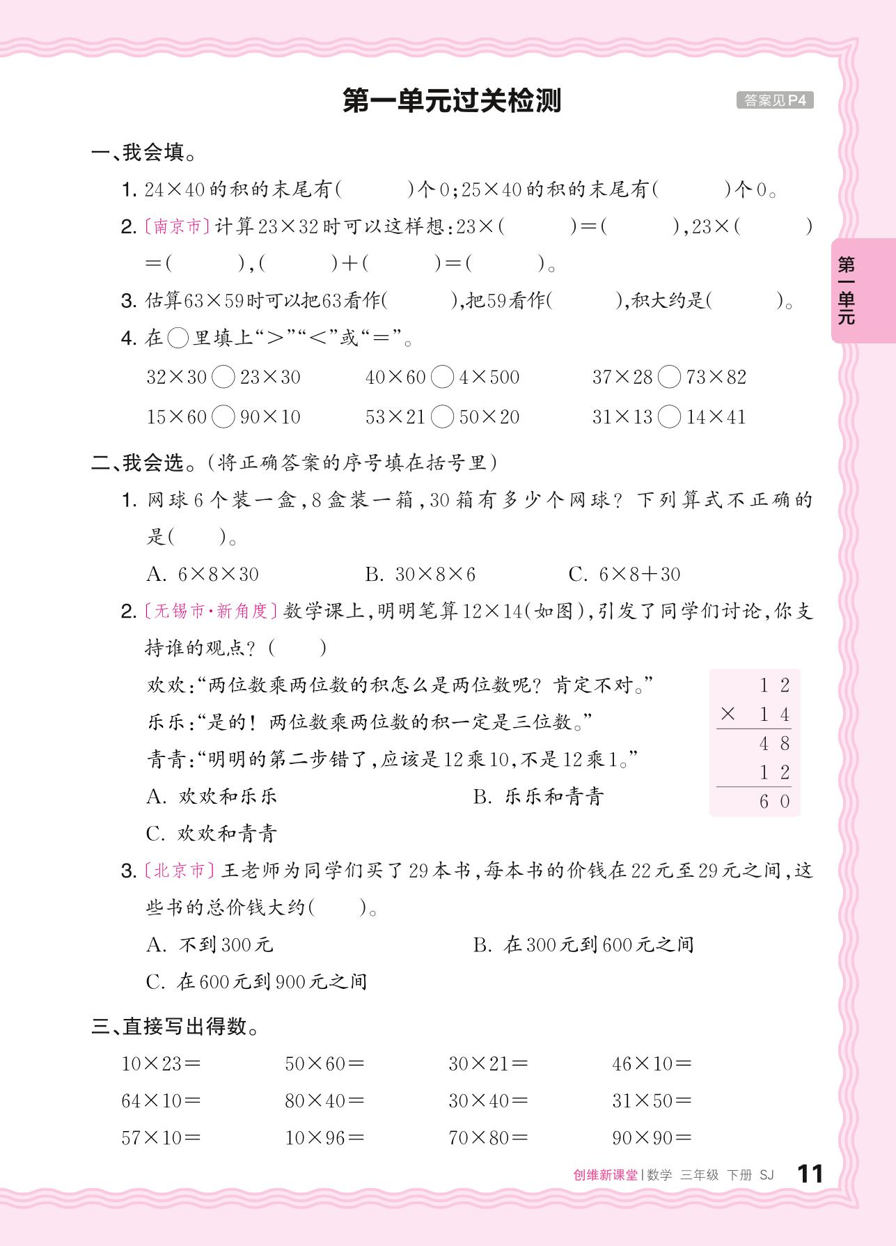 三年级数学苏教版下册单元卷