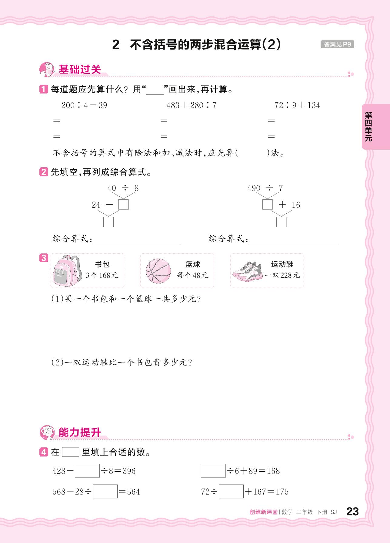 2024春下册三年级数学苏教版 第四单元 混合运算——2. 不含括号的两步混合运算(2)_R240124091808672