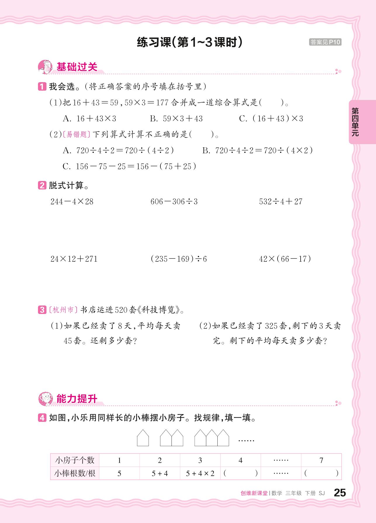 2024春下册三年级数学苏教版 第四单元 混合运算——不含括号的两步混合运算、含有小括号的混合运算练习课